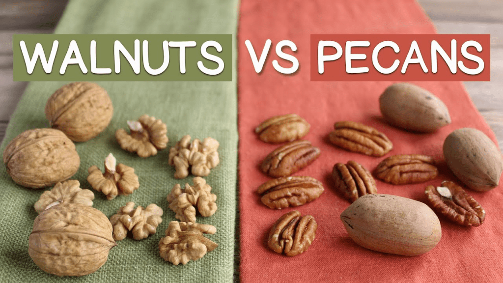 Pecans are the American cousin of the walnut. They have a lot of similarities, but a lot of differences too. The shells are different, with the pecan shells being smoother, but the inside kernel is similar in looks. Pecans are elongated and oval with deep grooves, while walnuts are rounded and have a brain-like appearance. Pecans are also sweeter, with a creamier, more oily texture than their walnut cousins. Walnuts also tend to be a bit more bitter and crunchier than pecans. Both are very healthy, but offer slightly different nutrient values. Pecans are richer in fiber and vitamin E, whereas walnuts are higher in protein and omega-3 fatty acids. They are known to be good for the heart, among other parts of our bodies as well. Pecans also tend to be smaller than walnuts.
