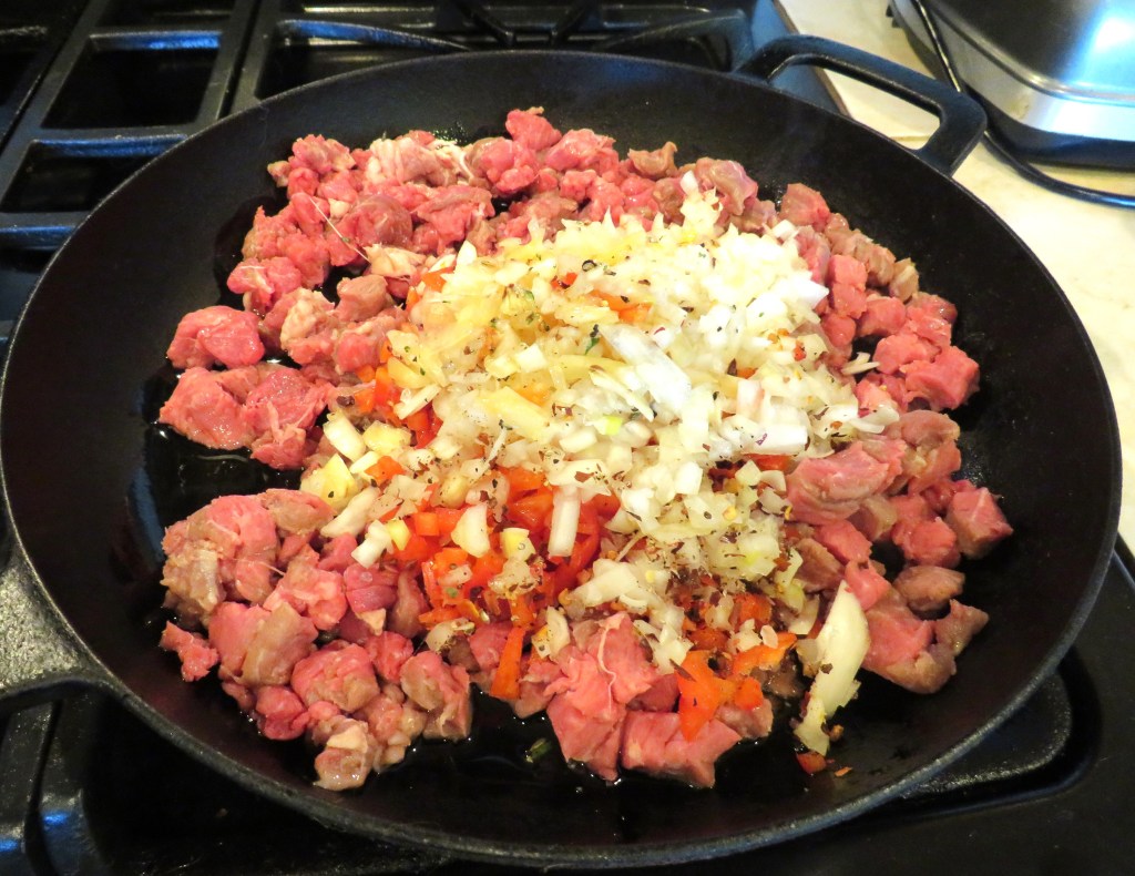 Combine the peppers, garlic, onions and seasonings together. Get a large skillet very hot, then add the olive oil and the pepper and garlic combination. Cook until the onions and peppers are softened, about 5 minutes.