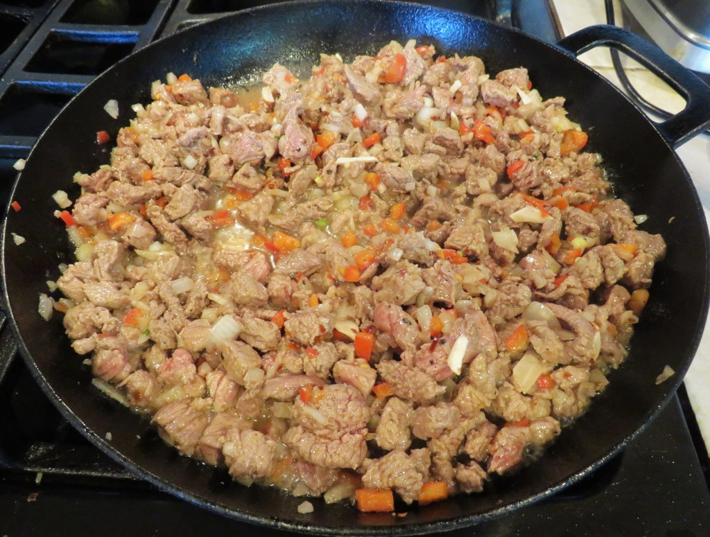 Apples and onions are perfect companions for pork, so I sliced them thinly, along with some red pepper strips, and added a dash of lemon juice to the apples, a little more cinnamon, nutmeg, lemon zest, salt & fresh ground black pepper.