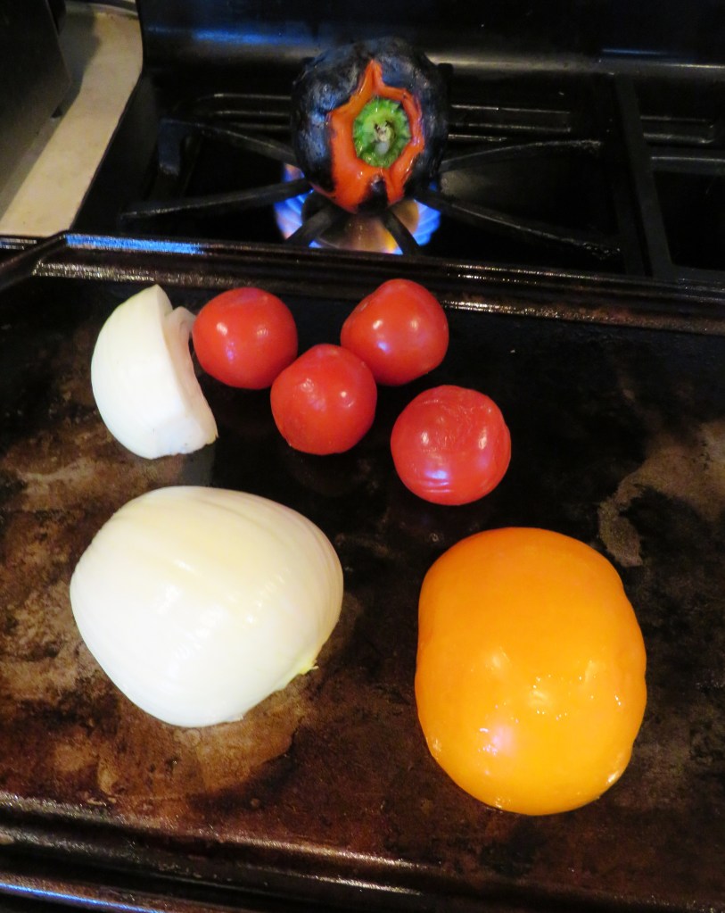 When the flames die down, add the chicken broth, wine and about half of the tomatoes. I used a combination of red and yellow heirloom tomatoes and Campari tomatoes. I added the red tomatoes at this time.