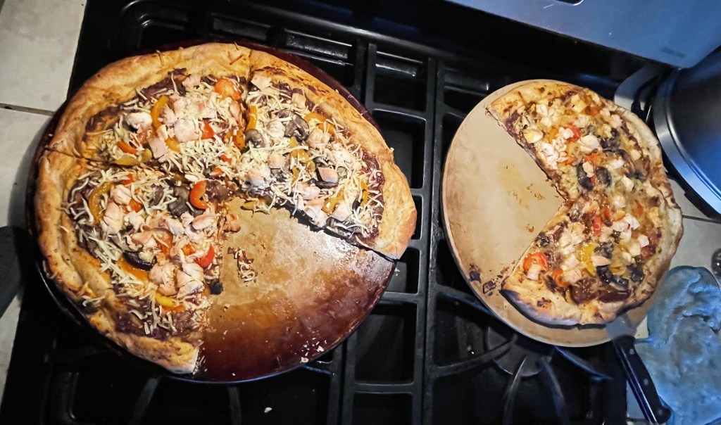 The other day, when I made my thick tomato sauce, for my sausage and peppers https://ajeanneinthekitchen.com/2026/02/27/big-bold-red/, I had a lot of sauce left over. Of course I didn’t want to make the same thing again. So what did I make instead? Pizza, of course.