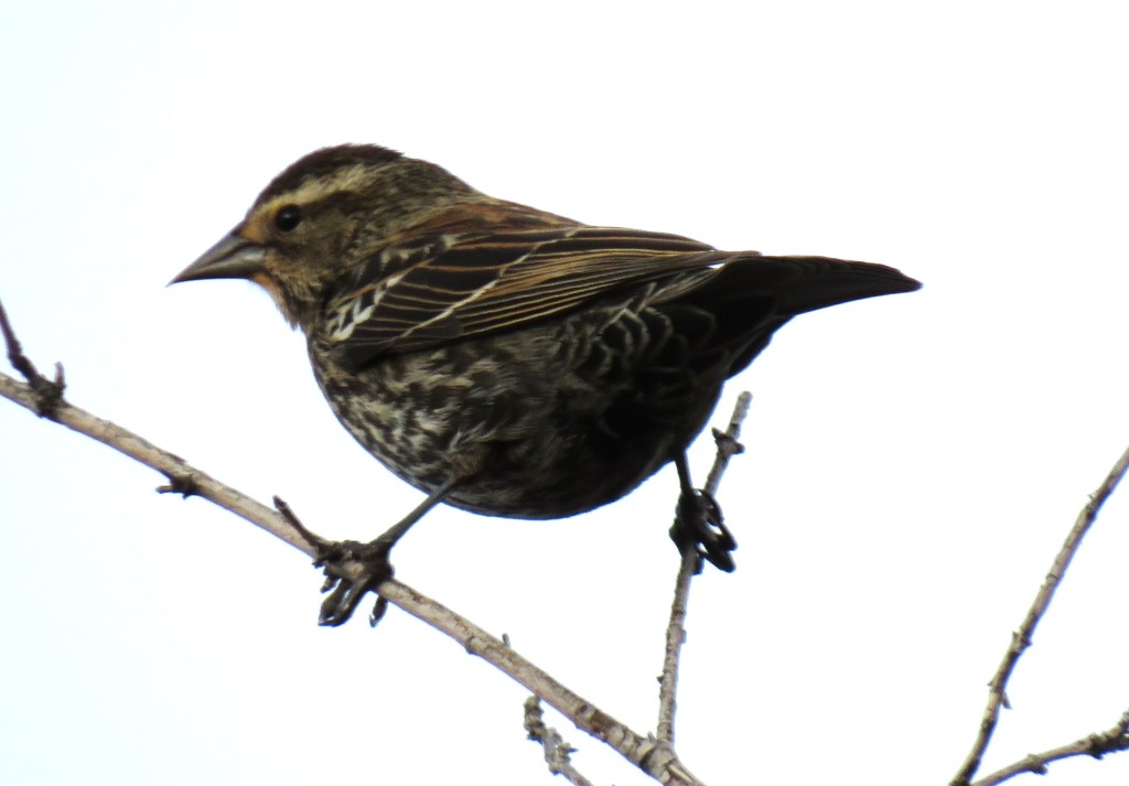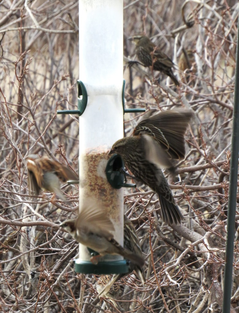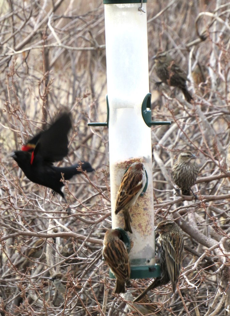 We saw more birds eating at the bird feeders behind the Nature Center than we did out on our walk. There were mainly various sparrows and red-winged black birds.