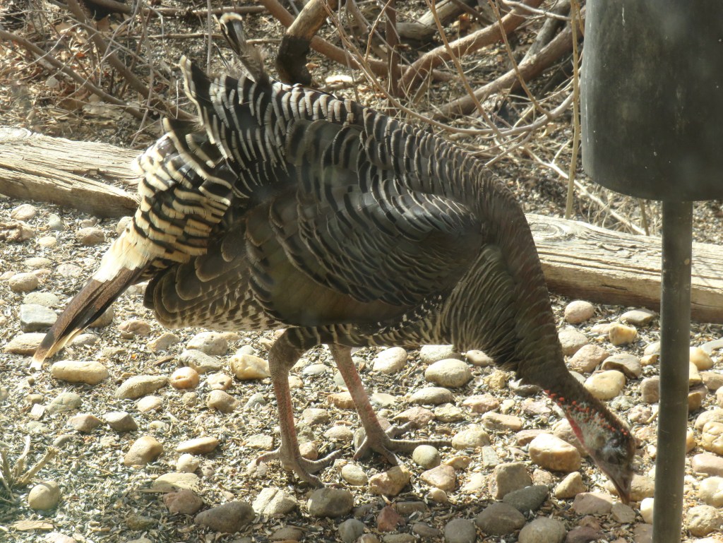 We saw a wild turkey out on the walk too, Larry is the one that pointed it out to the “experts”. On first glance, the “experts” thought is was a Canadian goose, but to their credit, we were quite a bit a way, though they had their big scope and should have been able to tell right away. But again, once we got back to the bird feeders, at the back of the Nature Center, sure enough, the turkey was there too, eating with the rest of the birds.