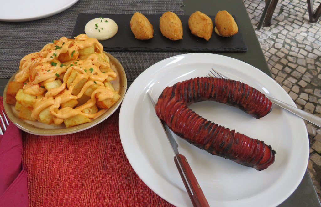 We also ordered the cod cakes, that we ended up eating quite a few times on our trip, and one of our favorites patatas bravas. Patatas bravas are Spanish, but Spain and Portugal share many things, along with their long borders. The whole Eastern part of Portugal is bordered by Spain, from the north all the way down to the south.