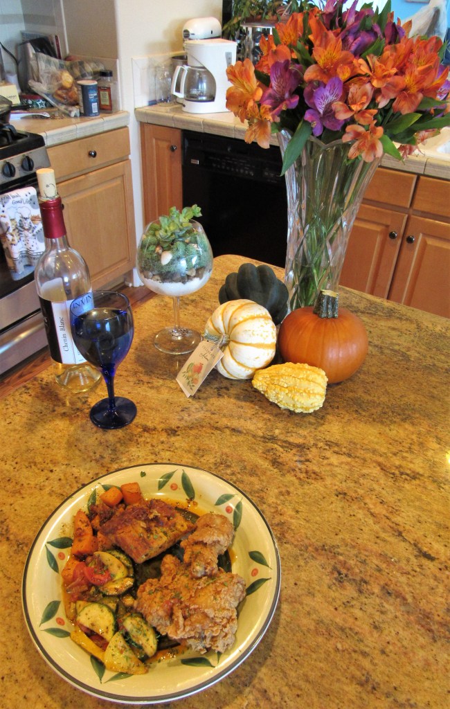 Fried chicken is about as simple and downhome as you can get. Both my Creole zucchini and tomatoes and sweet potatoes with bacon and onions were very simple too. But don’t downplay simple. Simple is still delicious!