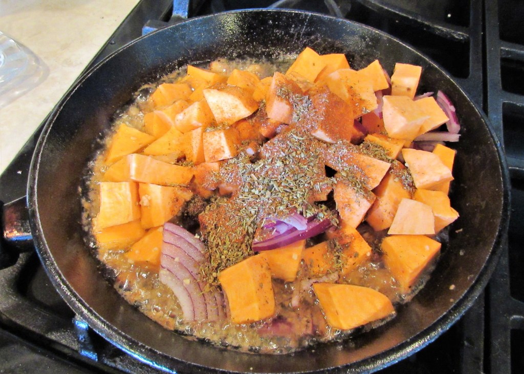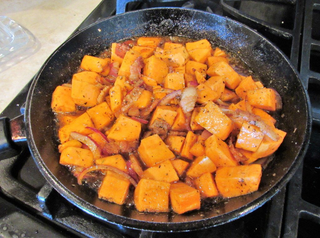 Cook the bacon until crisp. Then remove the bacon and set aside. Add the oil and/or butter and the sweet potatoes. Stir often so they don’t burn. Cook until the sweet potatoes are browned and crispy. Then add the spices and the onions and re-add the bacon.