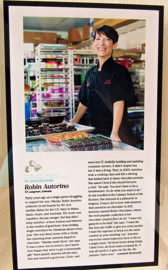 Chocolate is hard to work with because it is so temperature sensitive. If it is too cold, the chocolate won’t melt properly which means it will be very difficult to work with. But if it is too hot, the chocolate will melt and all you will have will be a liquid mess. It takes someone very skilled to be a successful chocolatier. I am NOT that person, but fortunately we do have a masterful chocolatier right here in the North Denver Metro area. Her name is Robin Autorino, and she is an award winning chocolatier who has been named by Dessert Professional as one of the Top Ten Chocolatiers in North America in 2013. Robin is the owner and master chocolatier at Robin Chocolates, located in Longmont, Colorado.