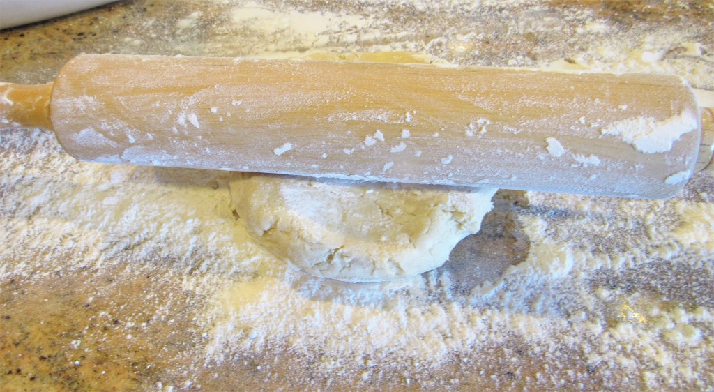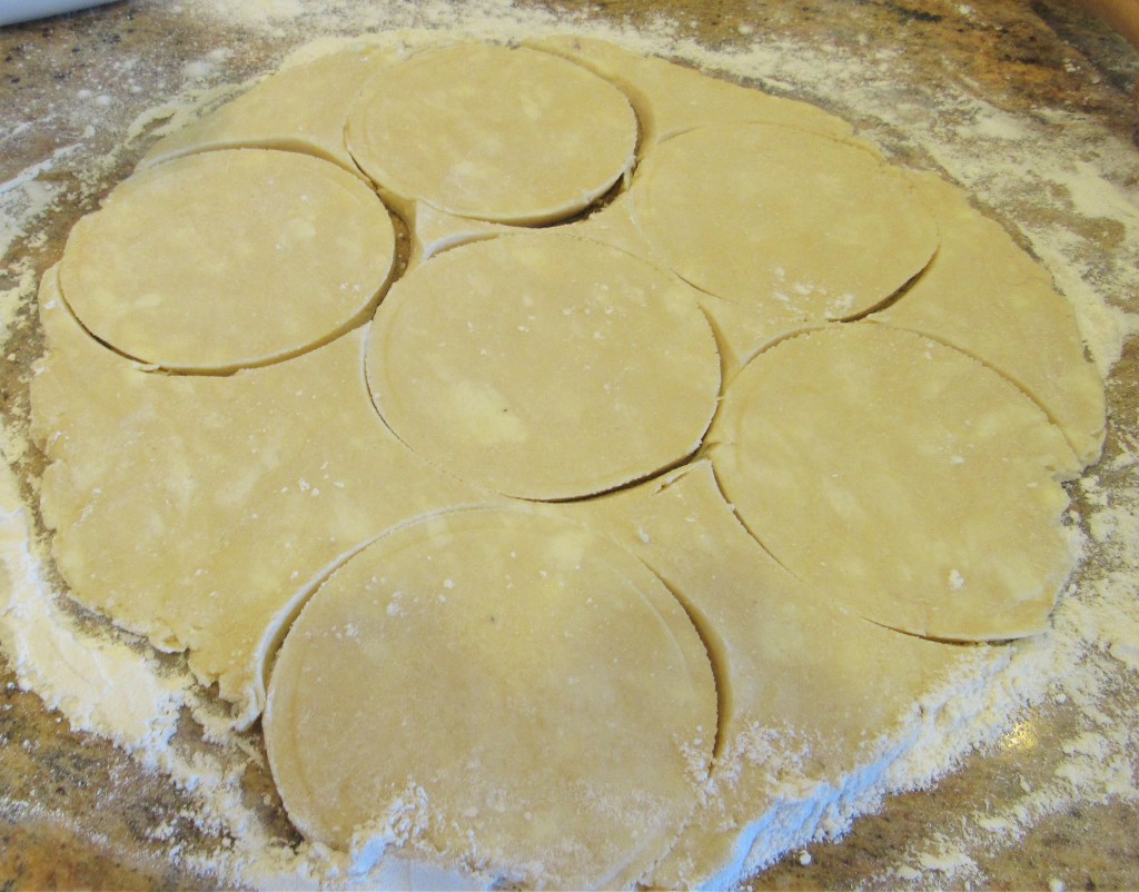 Once the dough is prepared, form it into a ball and roll it out on a lightly floured surface to about 1/2 thickness. Then cut into either circles or rectangles. You can make them any size you like. I cut mine into circles that were about 4 inches in diameter.