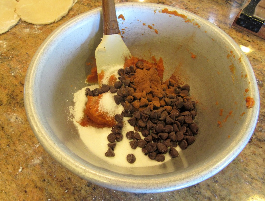 Combine the roasted pumpkin, cinnamon, the remainder of the sugar and about 2/3 of the chocolate. The pumpkin will be hot and will melt the chocolate.