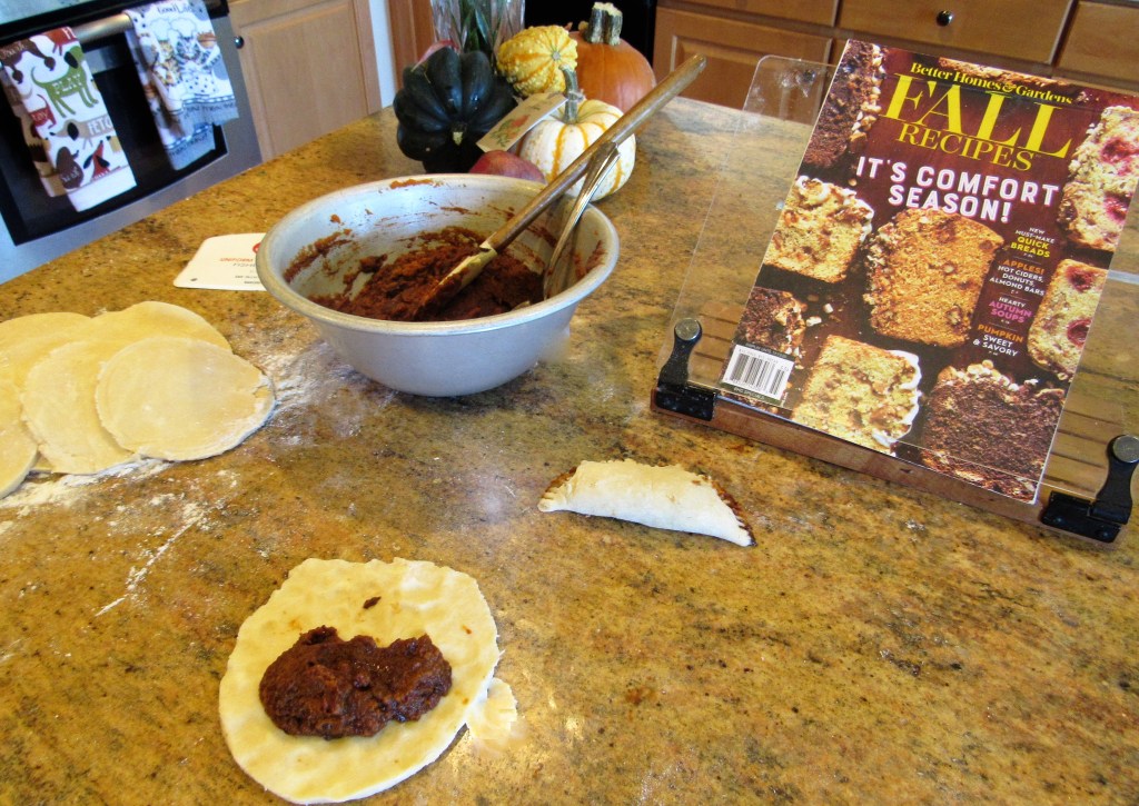 Add about 1-2 TBSP of the pumpkin mixture (or as much as the dough will hold) to each piece and fold over. Pinch the edges tightly, then crimp with a fork on the edges, so the filling does not ooze out.