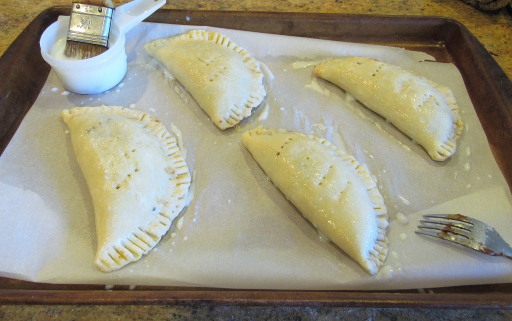 Once all the empanadas are made, poke them with a fork to make some air holes, then brush them with milk and place them in the oven at the reduced temperature. Bake for about 20 minutes or until they are golden brown and flaky.