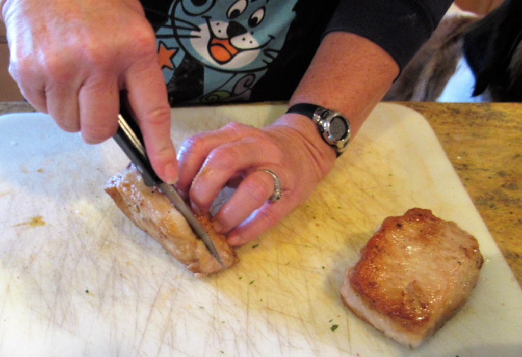 I started off by searing the pork chops, just until they were browned on both sides. Then I slit them down the middle and made a pocket for the filling. You want to use a sharp, serrated knife.