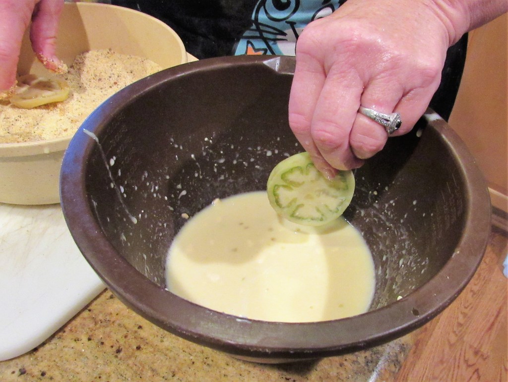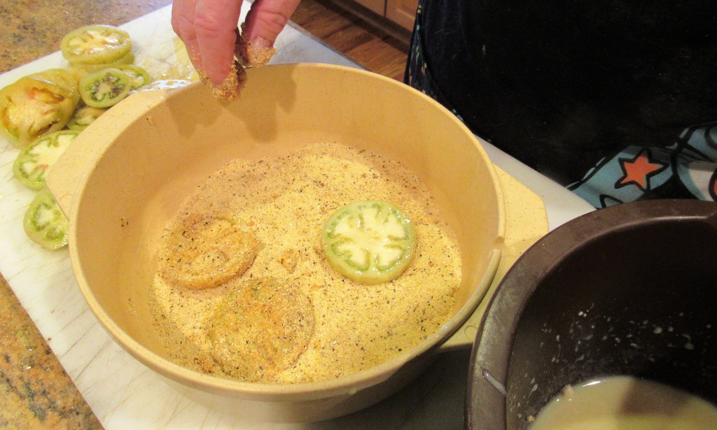Pat the tomato slices dry with a paper towel, then dip into the egg mixture and completely coat the tomato slices, shaking off the excess liquid. Then dip into the cornmeal mixture and completely coat, once again shaking off the excess coating.