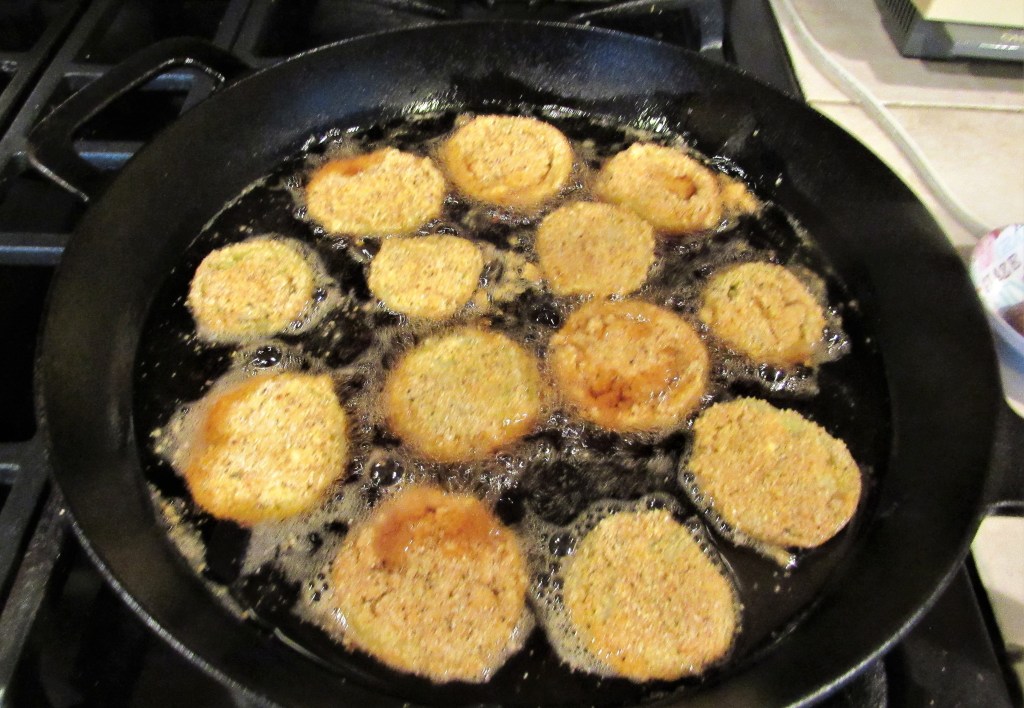 Once the tomato slices are all coated, place them on a baking sheet lined with parchment paper and refrigerate for about 30 minutes before cooking them. When the are ready, get about 1/2 inch of very hot oil and bacon grease (if using) very hot. You want the oil to be about 365*F. Carefully place the tomato slices into the hot oil. Do not overcrowd the pan. Repeat until all the tomato slices are cooked.
