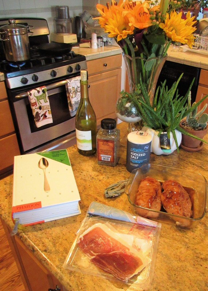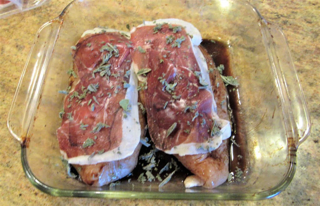 Ideally, you want to use a toothpick to secure the fresh sage leaves onto the chicken and prosciutto slices, but my sage was not as fresh as I thought, and when I tried to secure it with the toothpick, it broke into pieces. OK. No problem. I just completely crumbled it and scattered it on top of the chicken and prosciutto instead.