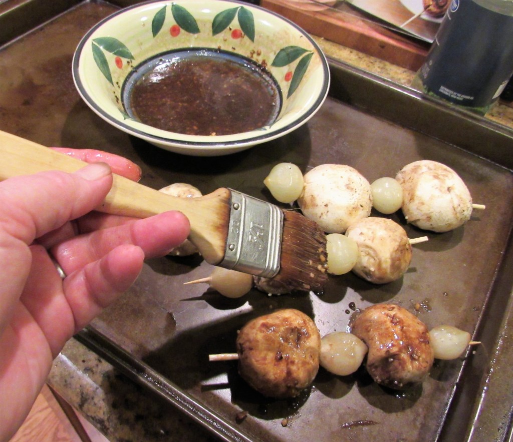 Brush the onions and mushrooms with the balsamic butter mixture. Place on the grill to cook for about 12 minutes, turning at least a couple of times to make sure everything cooks properly and to get good grill marks.