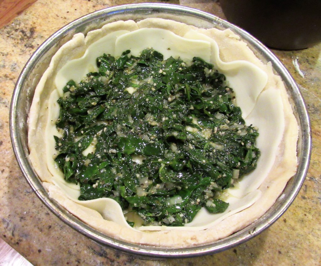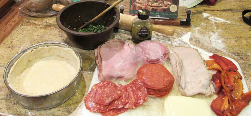 As I mentioned above, you can fill your torta rustica with anything you like. For this particular rustica, I used a variety of thinly sliced deli meats and mozzarella cheese, along with some roasted peppers and spinach with garlic and onions. I used 3 kinds of salami, ham and turkey.