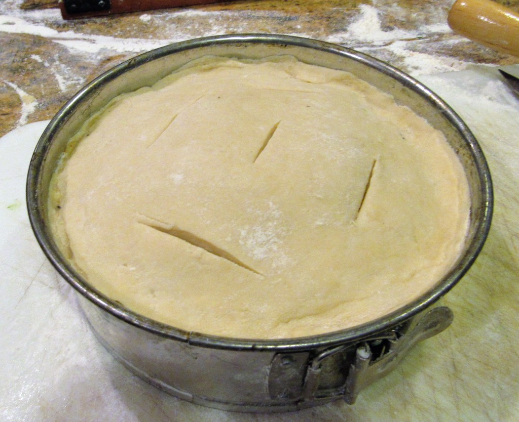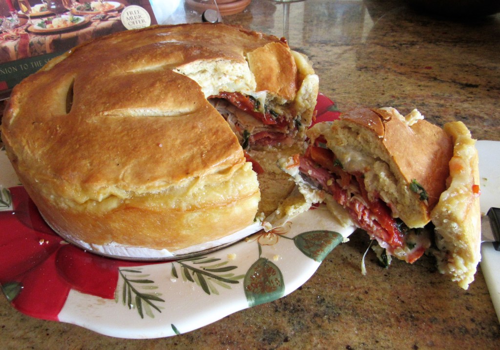 Place the torta in the oven and bake uncovered for about 30 or so minutes or until the dough is golden brown. Then cover with aluminum foil and continue to bake for about another 30-40 minutes, or until the center reaches an internal temperature of about 120* F. If you are serving it hot, allow it to cool for about 5 minutes or so before cutting. If you want to eat it at room temperature, let it cool for about 1 hour, then cover with plastic wrap and refrigerate overnight. Remove it from the refrigerator about an hour before serving.