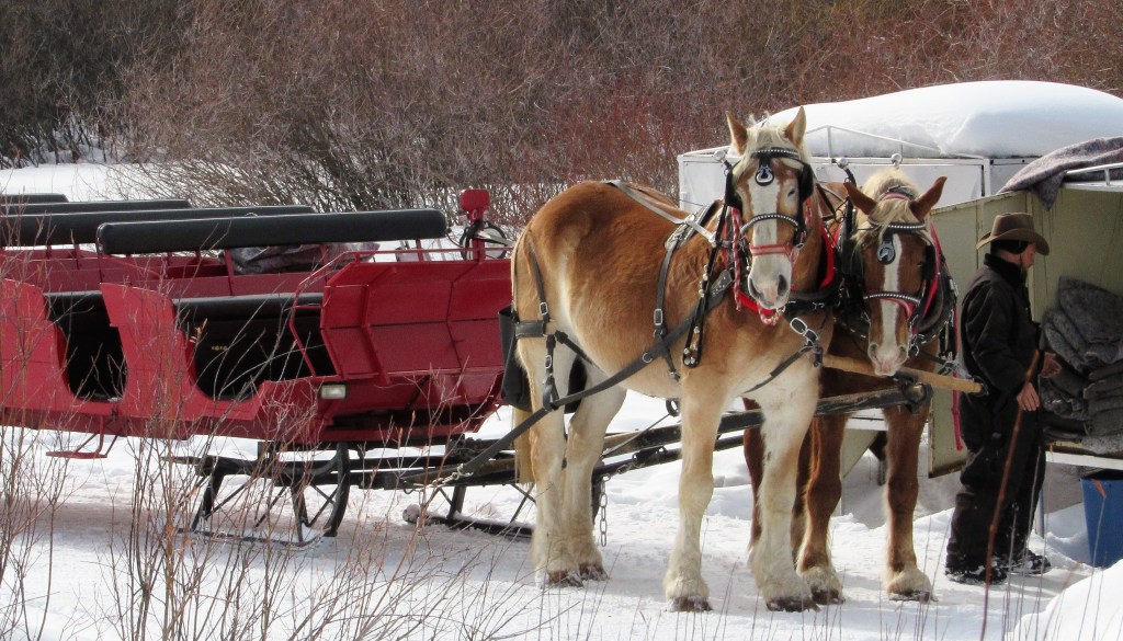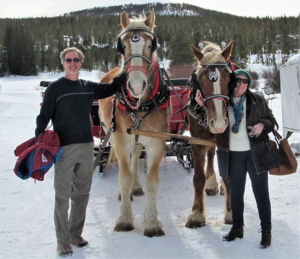 Here we are “dashing through the snow, on a one-horse open sleigh” …… OK a two-horse open sleigh, up in Breckinridge. These two big beautiful Belgian draft horses took us on sleigh ride through the hills. It was so beautiful.