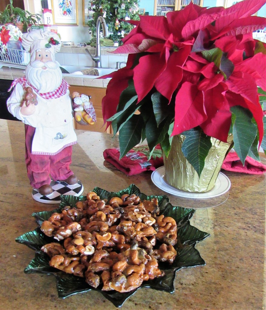 I made some cashew brittle for us to munch on through the holidays. This particular recipe is so quick and easy, and only takes about 15 minutes to make. And it is all made in the microwave too. I made it nice and nutty., but if you like it with more brittle and less nuts, just cut down on the amount of nuts used.