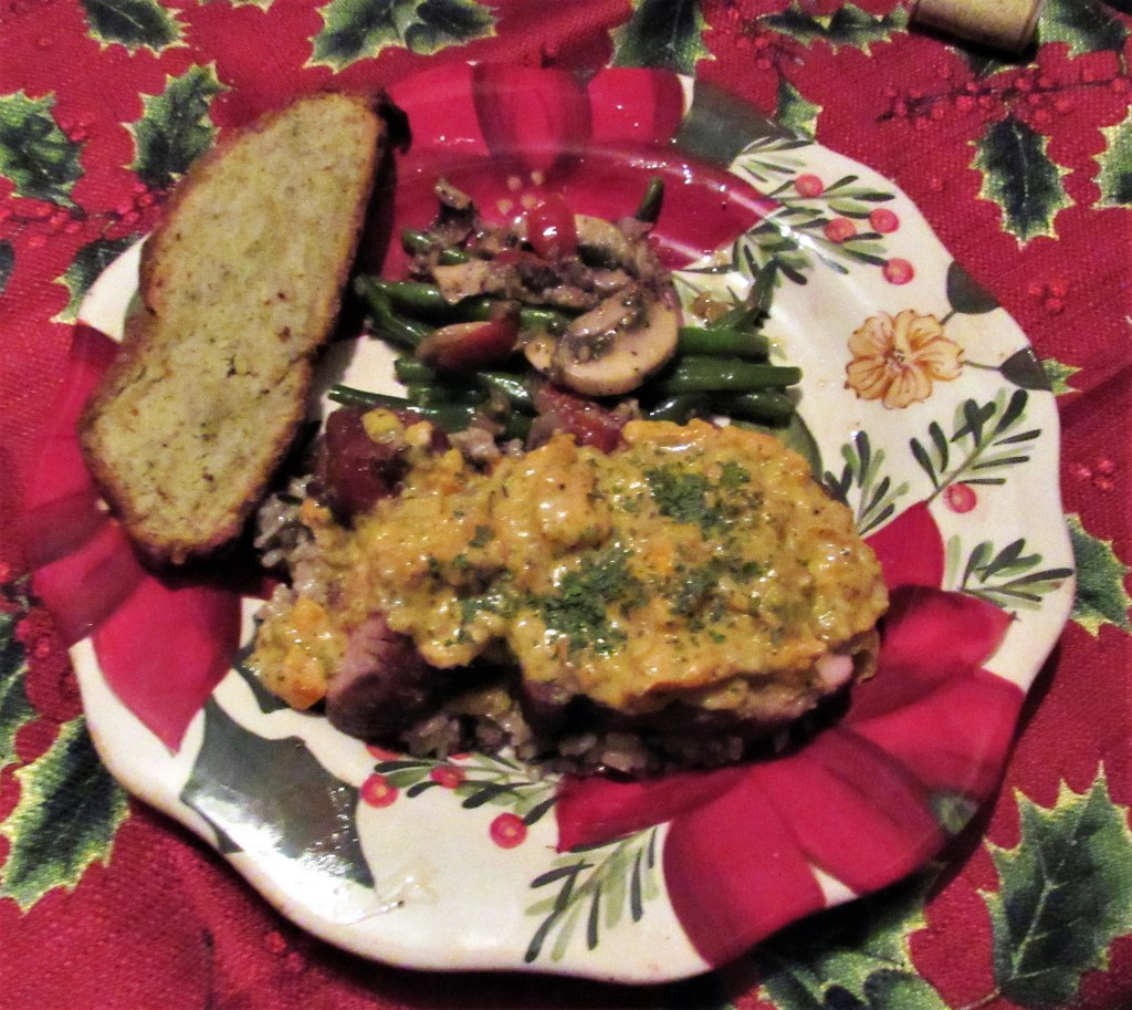 When the sauce is ready, top it over your favorite meat. You can also use this over pasta too if you like. As I said, I served it over smoked pork, and it was an awesome combination. I served it over wild rice with some green beans and mushrooms on the side, as well as some of my Hungarian potato dill bread and a creamy chardonnay to complete the meal. Hungarian Potato Dill Bread