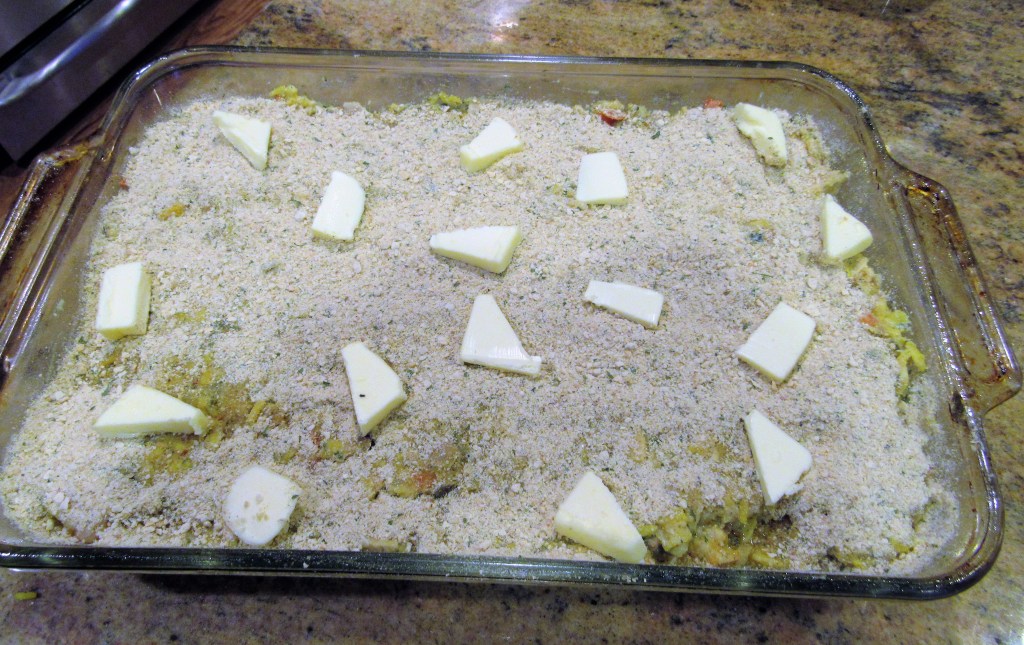 Sprinkle bread crumbs over the top of the casserole and dollop with butter.