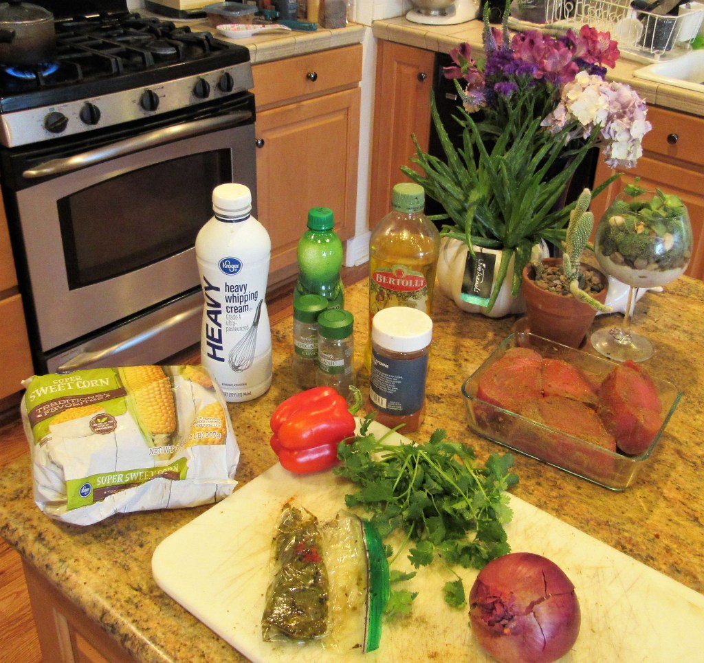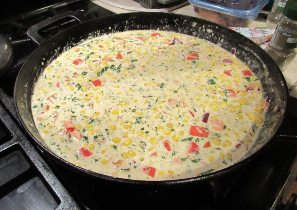 Cook the corn, onions, bell pepper and garlic together in the olive oil for about 2-3 minutes, or until the pepper and onions soften.