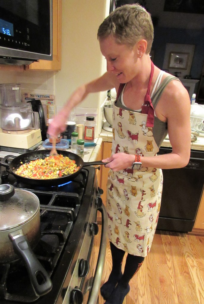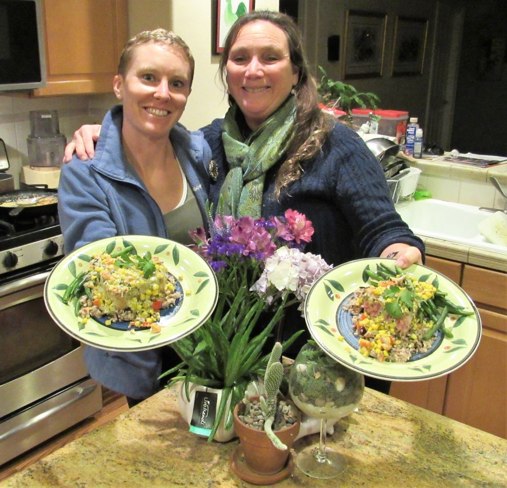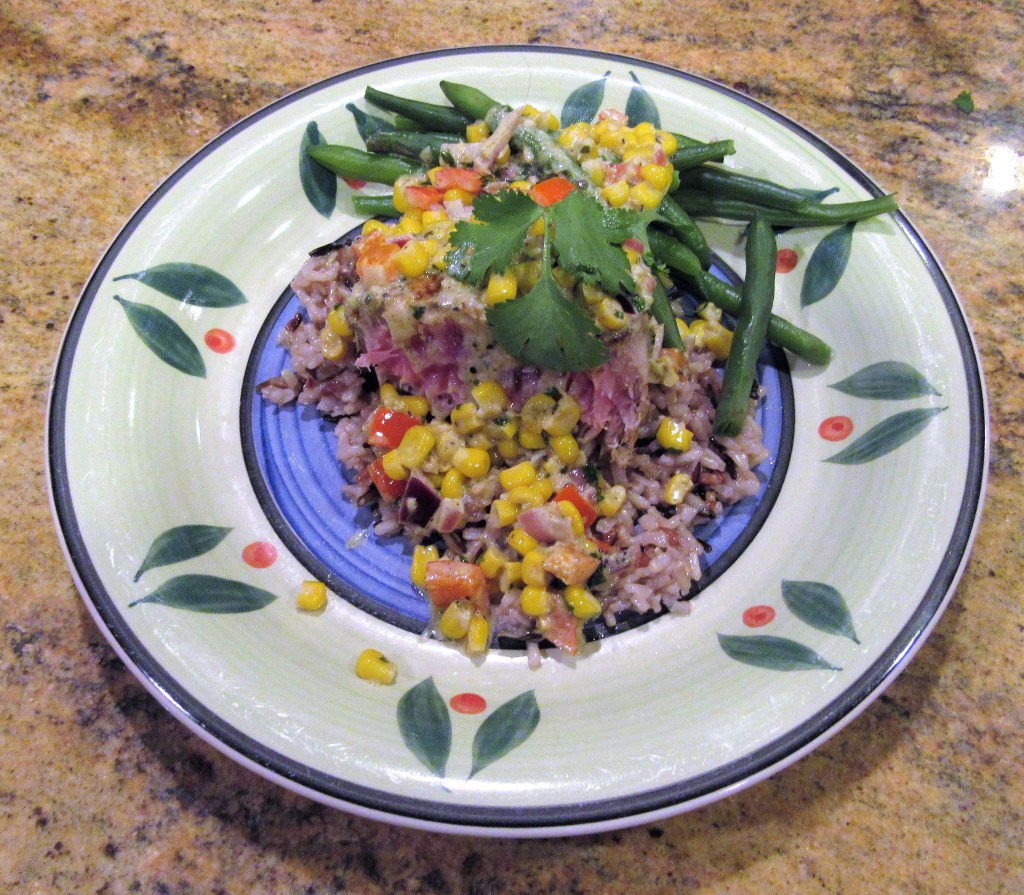 I marinated the tuna steaks in some cumin, sage, cayenne pepper and olive oil for about 30 minutes or so before Elizabeth arrived. Then we made the sauce together. As usual, it only takes a few basic and simple items that we almost always have on hand. I served the tuna steaks over wild rice, with green beans on the side, then topped it with our creamy corn and roasted Hatch pepper chili sauce.