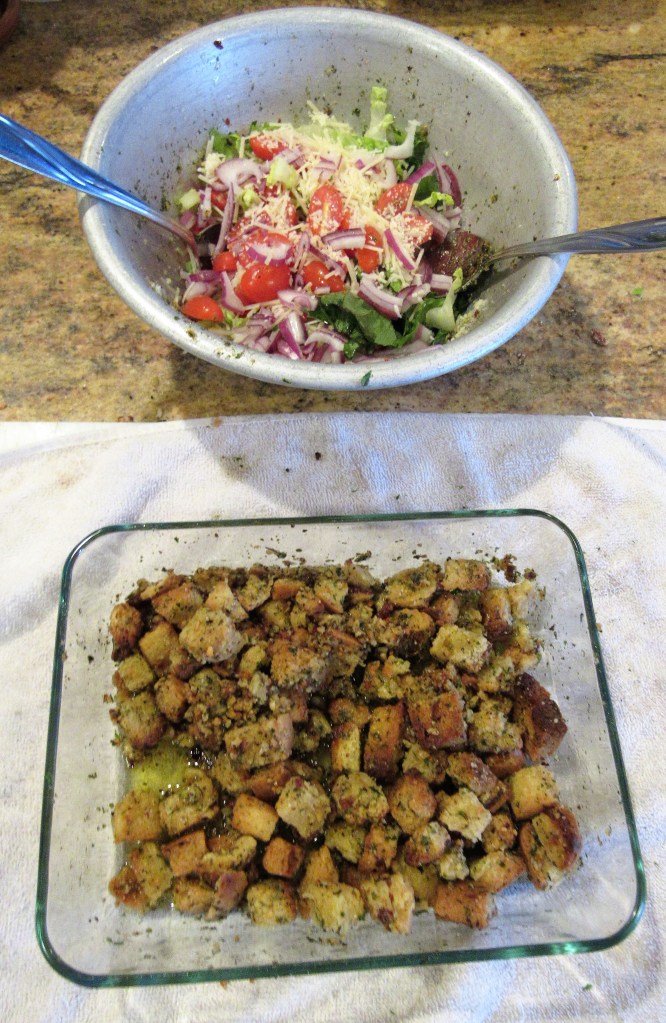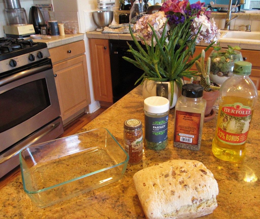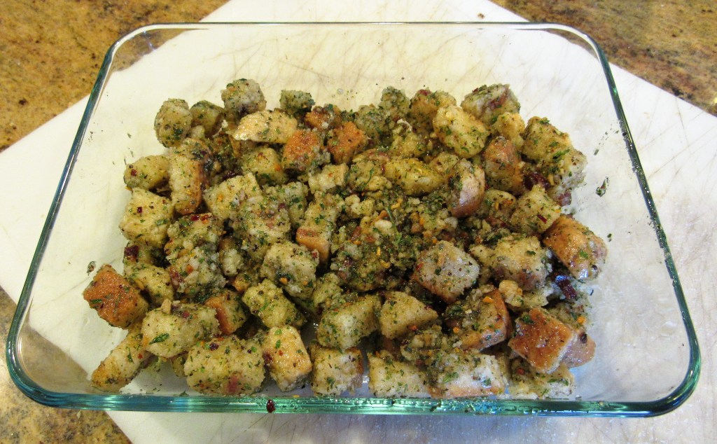 The ends of my maple, bacon and shallot bread started to get a bit too hard to really enjoy on their own Maple, Bacon and Shallot Bread so rather than throwing them away, I just cut them off and coated them with olive oil, pepper, roasted garlic and parsley, then roasted them until they were nice, golden brown croutons. When they were done, I added them to the salad. Delicious! The lunch, the salad and the croutons got rave reviews.