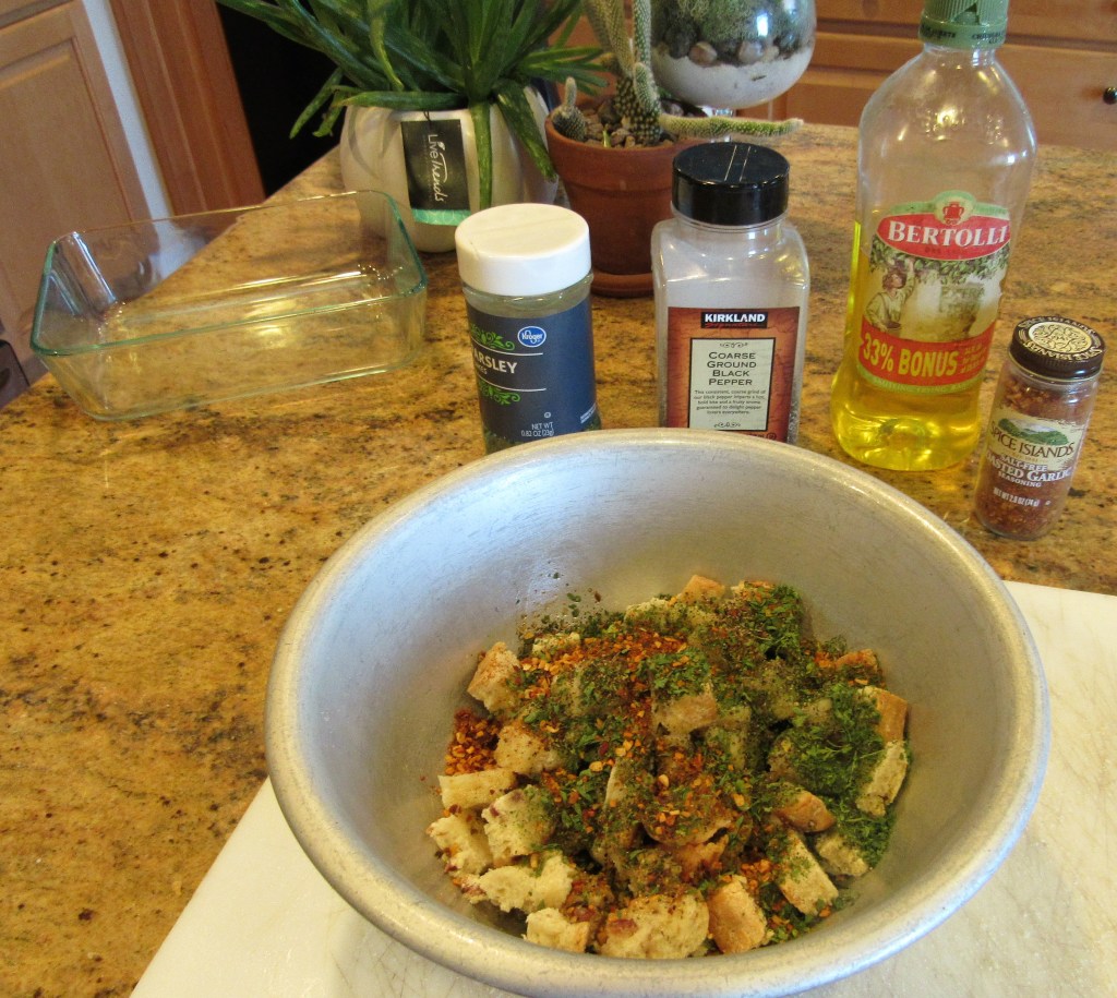 Once the bread is cubed, coat it in olive oil and add the seasonings of your choice. Mix them up a bit. Croutons never have to be the same. This time I used dried roasted garlic, black pepper and parsley. Thoroughly coat the bread with the oil and the seasonings, then place it in a single layer on a baking sheet or in a baking pan.