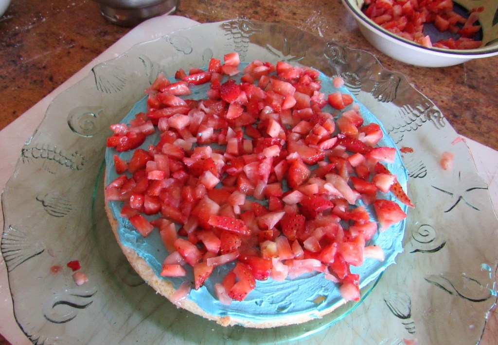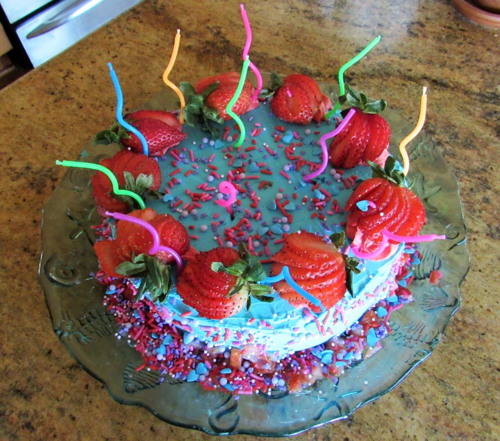 I started off with a box cake mix and made it vegan, since Cora is vegan too. Then I added strawberries and some fancy, funky candles.