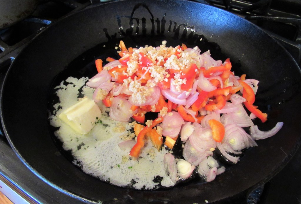 Heat the butter and olive oil in a large skillet and add the bell peppers, shallots and garlic. Cook for about 5 minutes, or until the peppers and onions are soft.