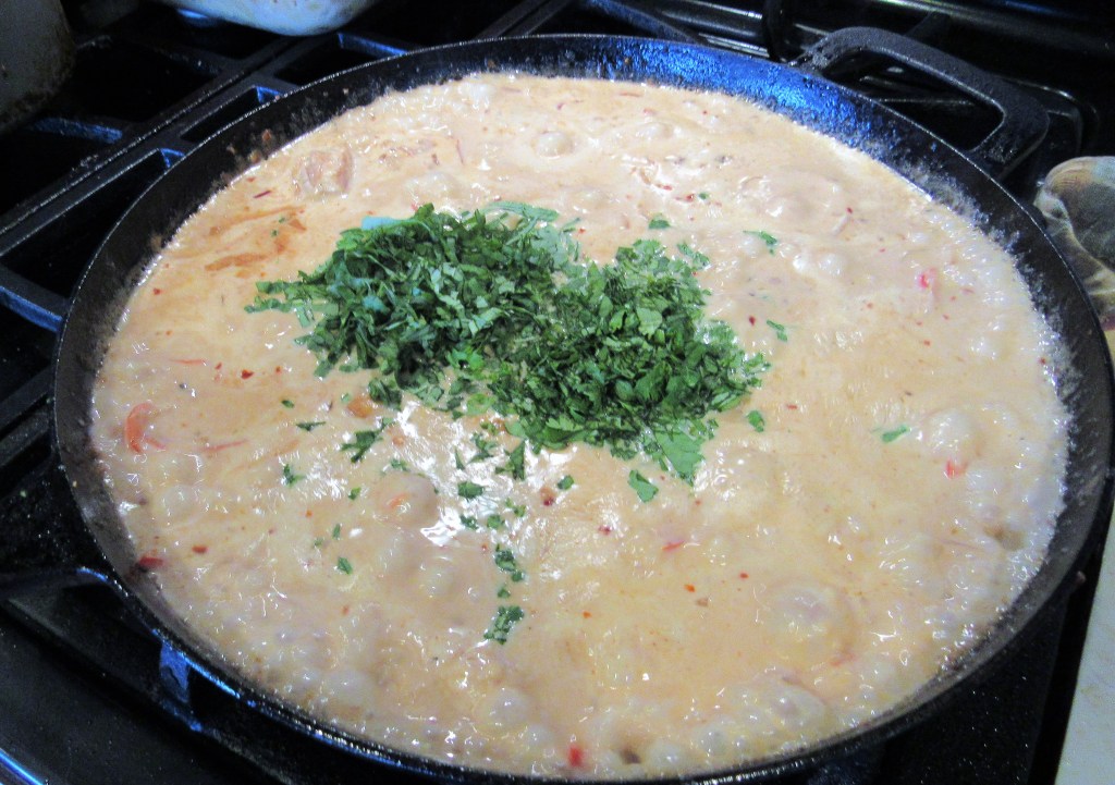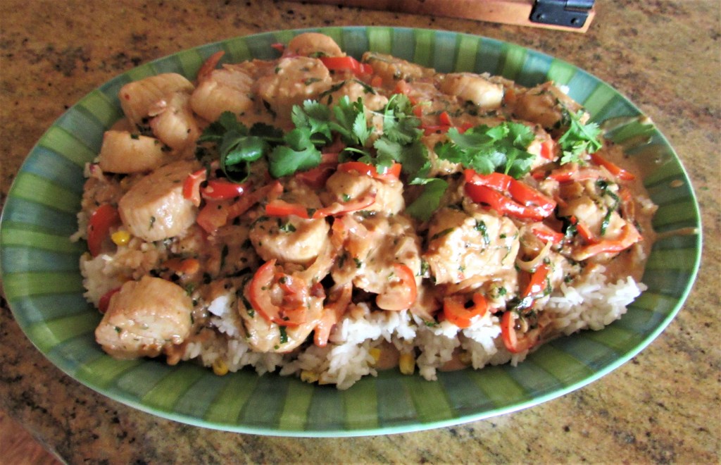The other night, before the birthday celebrations took place, Another Birthday Celebration, Another Blue Cake we enjoyed a delicious dinner that was once again a combination of everyone bringing something to the table. Gabe had made some vegan mac and cheese for the girls, Priscilla made a delicious brushetta and I made some guacamole for starters and the main meal was the scallops in a spicy orange cream sauce. Everything, as usual, was a big hit. Once again, another successful get together in the books.