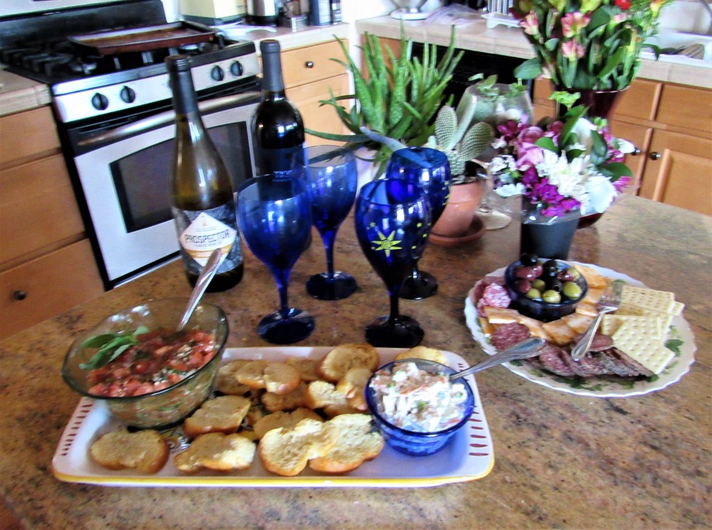 I just made a simple cheese and cracker platter and then made a quick bruschetta as well. I didn’t know Janet and Bob were bringing gourmet olives, or I would have skipped the olives, and used the gourmet olives. next time. But I did combine some Greek olives, Kalamata olives and black olives. I also bought some chicken salad to top either our crackers or our crostini with as well.