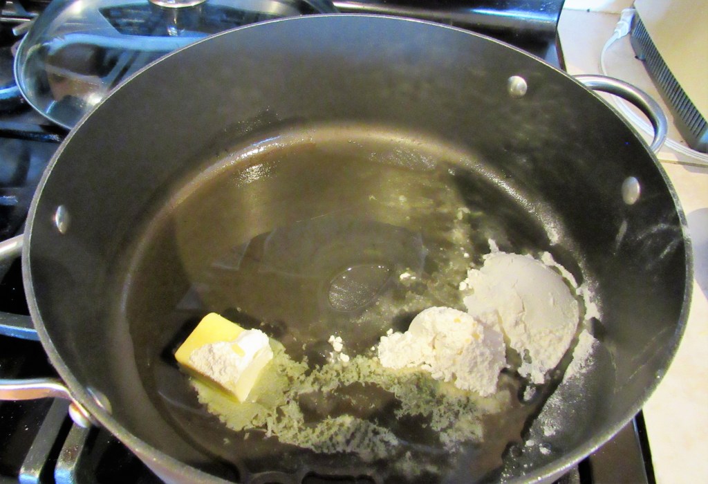 Because I like my soups on the thicker side, I made a roux with equal parts fat (I used butter and olive oil) and flour, then I added the carrot and onion mixture. Cook for about 5-7 minutes, or until the onions are soft and translucent.