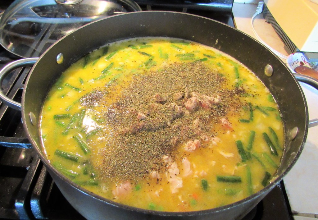 Add the green beans, peas, chicken, seasonings and chicken broth. Mix together well. Bring to a boil then reduce the heat to a simmer and continue to cook for about 10-15 minutes, stirring occasionally.