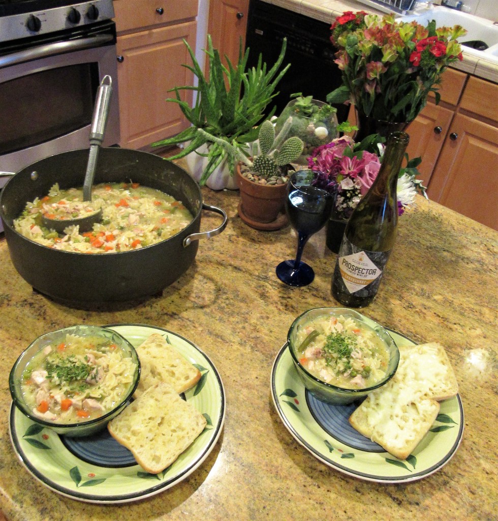 I like lots of stuff in my stuff, and that includes my soups as well. So I always add a lot of vegetables to whatever soups I make. This simple meal was completed by adding some warmed ciabiatta and a glass or two of a buttery chardonnay.