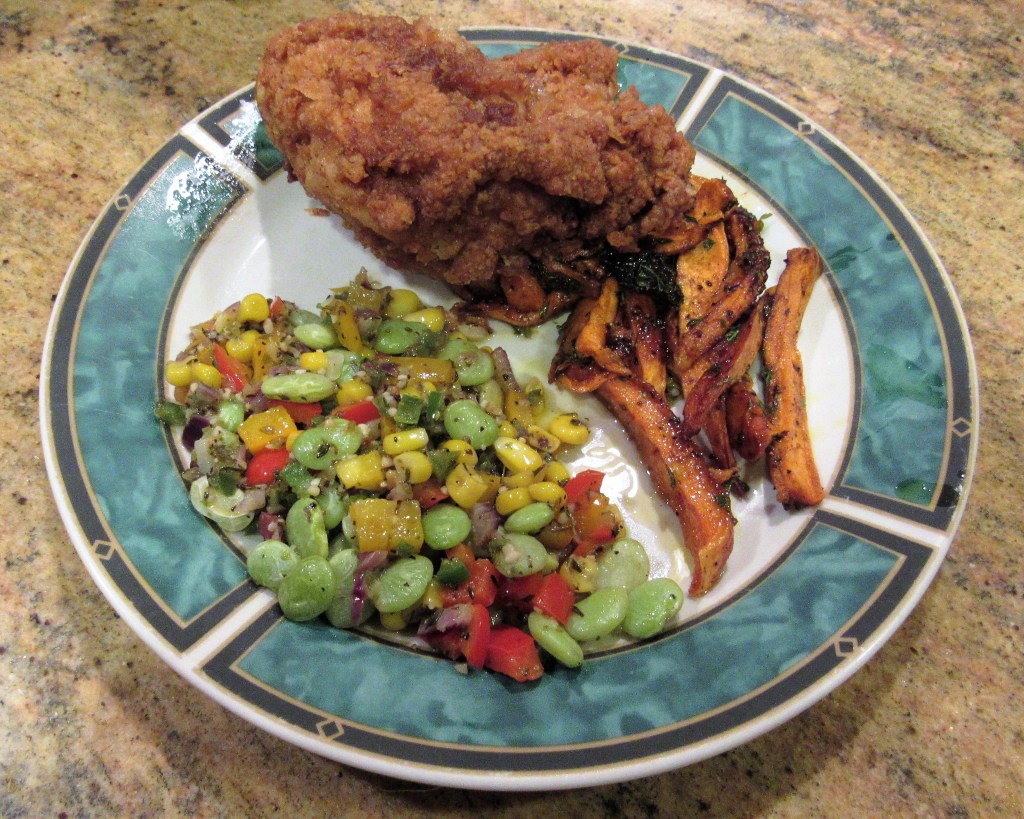 Whether you call them “yams” or sweet potatoes, it doesn’t really matter. All I know is both are very tasty and very nutritious. I love them both. I made some sweet potato steak fries to go along with our fried chicken and Southern Succotash that were a big hit. Some Southern Succotash They were all great Southern flavors that went together very well.