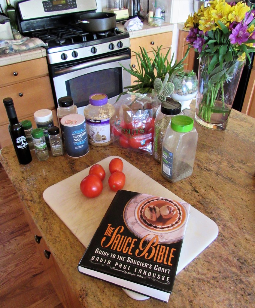 I used a combination of both extra virgin olive oil and some of my new Tuscan Herbed olive oil that i received as a birthday present !Viva Oliva! . I just put all my ingredients in a large pot and cooked everything down. Quick and easy-peasy and definitely delicious. I used a combination of both Roma tomatoes and hothouse tomatoes. The flavors of the fresh tomatoes were just bursting out. You can use fresh or dried herbs, but I find when I am making a sauce, that I am slow cooking, the dried herbs hold their flavors better. Fresh herbs are used more for a last minute addition.
