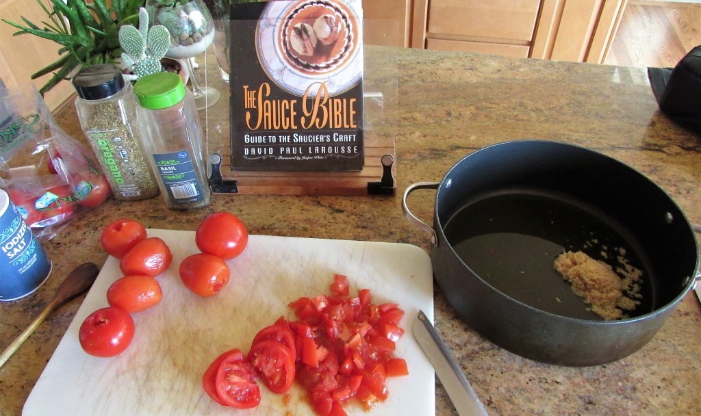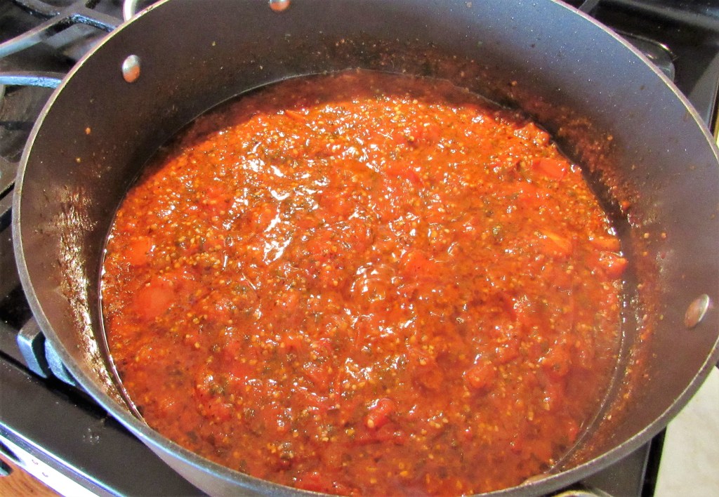 As per my normal way of cooking, I had little bits and pieces leftover from other meals, and I put my thinking cap on to come up with a way to use them all up yet be creative and do something different as well. I had some more pepperoni and salami and just enough dough leftover from my latest torta rustica, Channeling the Italian Nonnas to make a small pizza. Well pizza needs a sauce right? And I had plenty of tomatoes. So I decided to make marinara sauce for the pizza. It couldn’t have been any easier – tomatoes, garlic, olive oil, herbs and salt and pepper. That’s it. It made me think of the old commercials for the Prego sauce where people were comparing the jar of Prego sauce to mamma’s home made sauce, and they said “it’s in there”, talking about all the flavors from home.