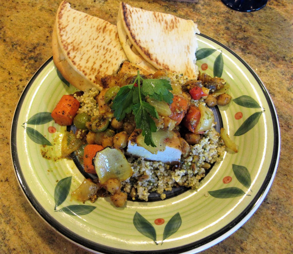 When the chicken is cooked and at temperature and the vegetables are tender, it is done. I served this over couscous, but you can also serve it over rice as well. I also added some warmed pitas and Hanaa’s red pepper hummus, completing the meal with a dry pinot gris on the side. It was so good and full of bold, zesty flavors. It was a very warm and comforting meal from the inside out.