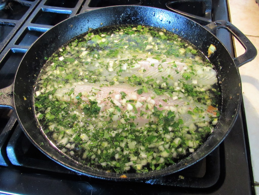 Place the fish in a large skillet, add the onions and parsley and white wine vinegar, then completely cover the fish and toppings with cold water. Bring everything to a boil, then reduce the heat to a simmer, cover the fish and continue to cook for about 20 minutes.
