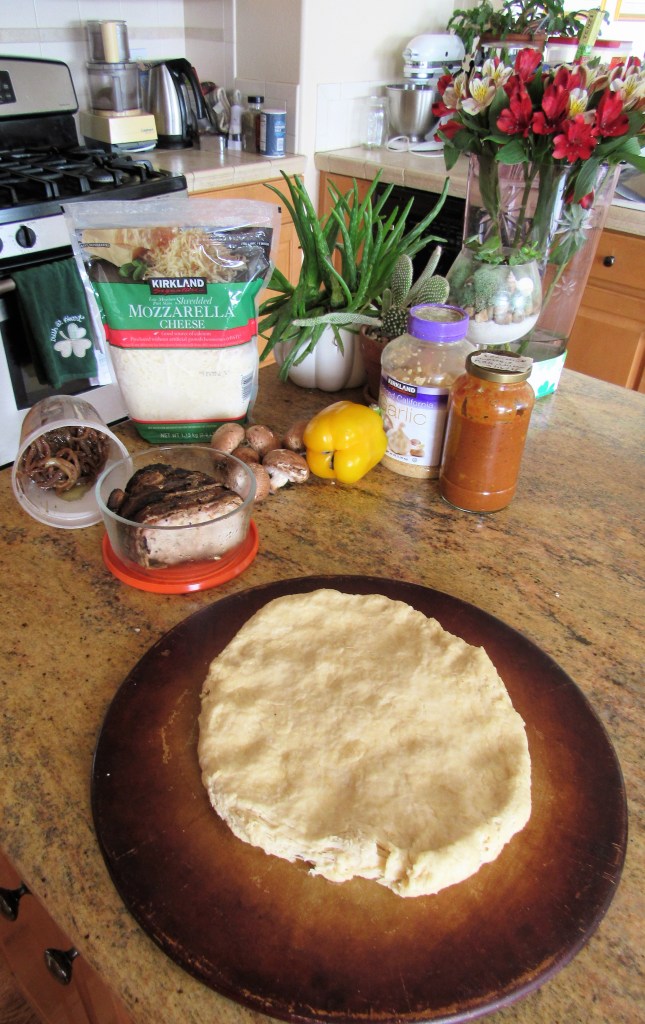 Pressing the dough onto my pizza stone was first, followed by the sauce and cheese. I used both cheddar and mozzarella. Larry likes cheddar and I prefer mozzarella.