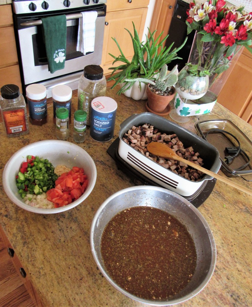 I diced everything up and placed it all in the slow cooker, then walked away and forgot about it until it was time to eat. I like to add the meat first, then the vegetables and I mix all the wet ingredients together and then pour them over the top and mix it all together. Everyone has their own ways and they all work just fine too.