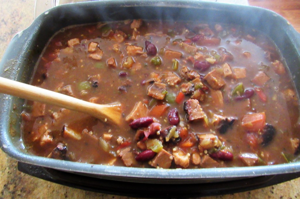 I am still using up portions of the meat we smoked from our Carnivores’ Gathering A Carnivores’ Gathering, and as usual, I am trying to use it in as many different ways as I can. This time, I made chili con carne, and believe me, it was full of carne or meat. I used some of the smoked brisket and the rest of the smoked bacon wrapped pork loin as well to make this very hearty, meaty, delicious stew.