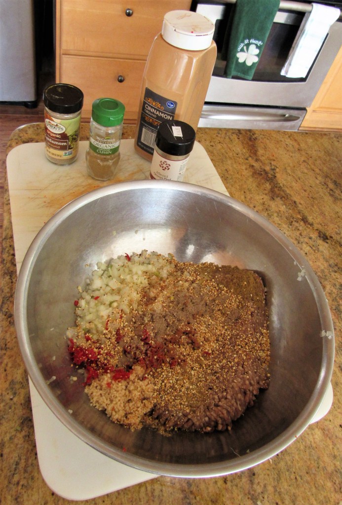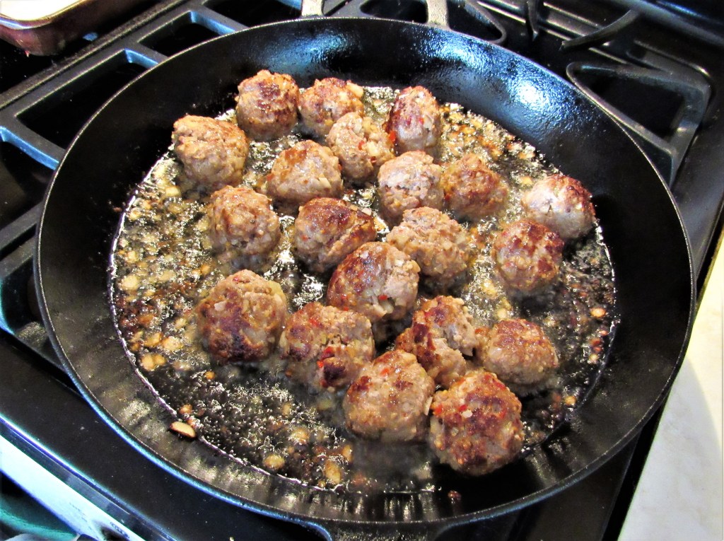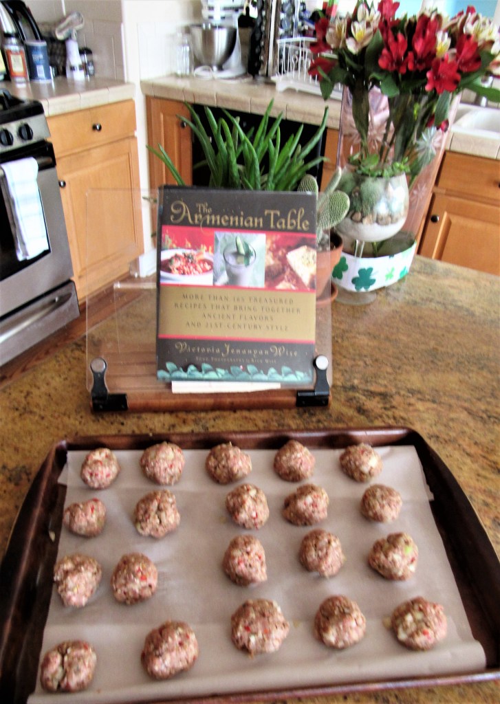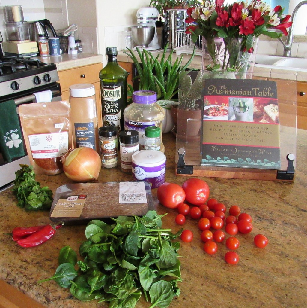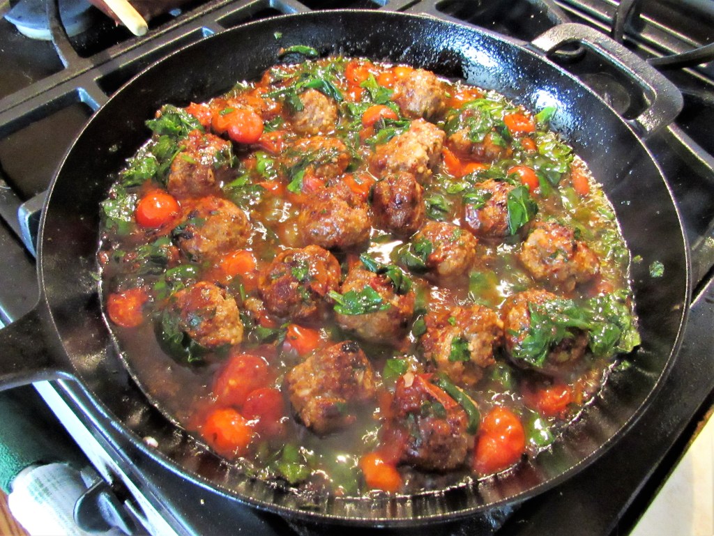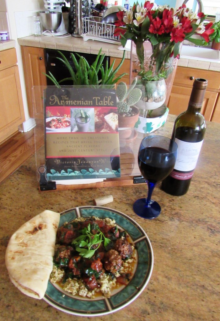 We had some ground lamb that was in our meat rotation, ready to be cooked. I had to do it justice, so I went through my ever-growing culinary library and found a perfect way to cook that ground lamb. I decided on an Armenian recipe, making them into spiced lamb meatballs with a tomato-spinach sauce. It was a great choice too. We both thoroughly enjoyed this spicy, exotic lamb creation.