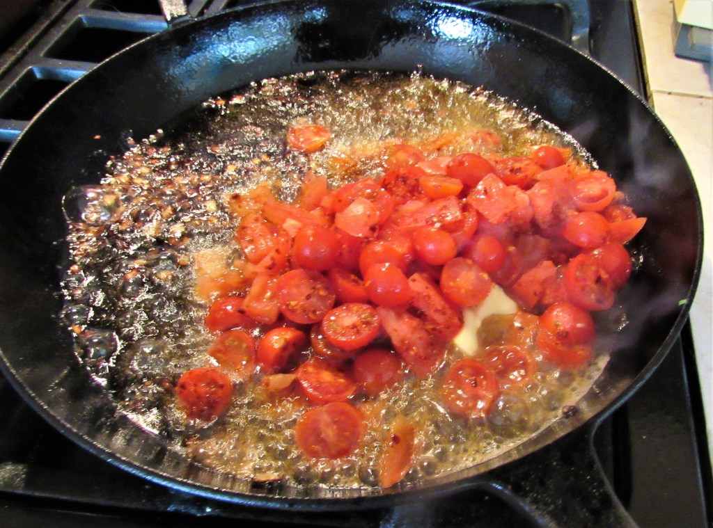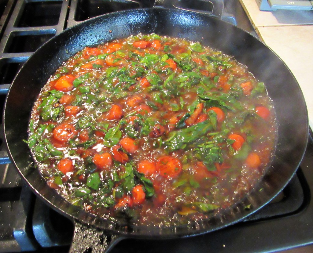 Add the butter to the olive oil and add the tomatoes and spices. Cook over a medium heat until the tomatoes start to break down, then add the spinach and the cilantro. The spinach and cilantro do not take long to cook.