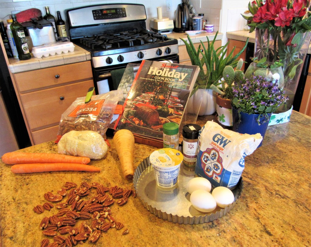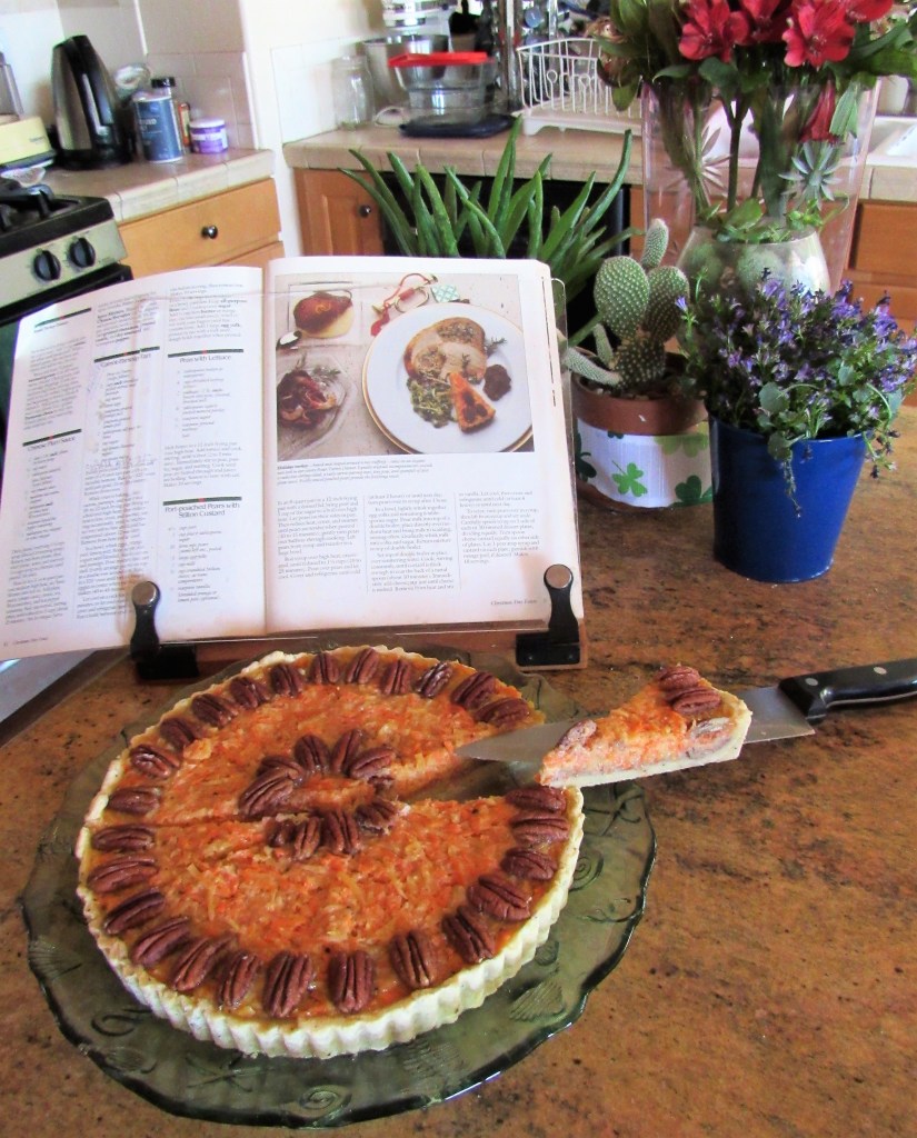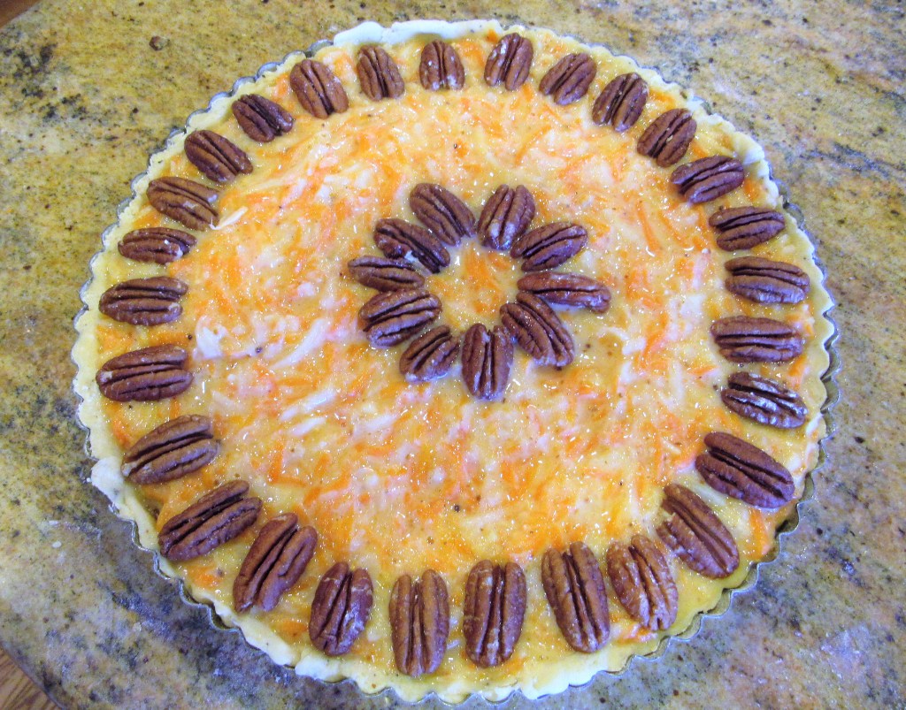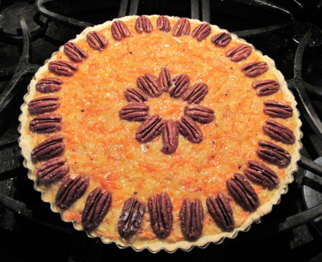 Spread the mixture evenly over the crushed pecans. Then arrange the whole pecan halves decoratively on top of the carrot mixture. Place the tart into the oven and bake uncovered for about 45-60 minutes, or until the crust is lightly golden and the center of the tart is set and no longer jiggles.