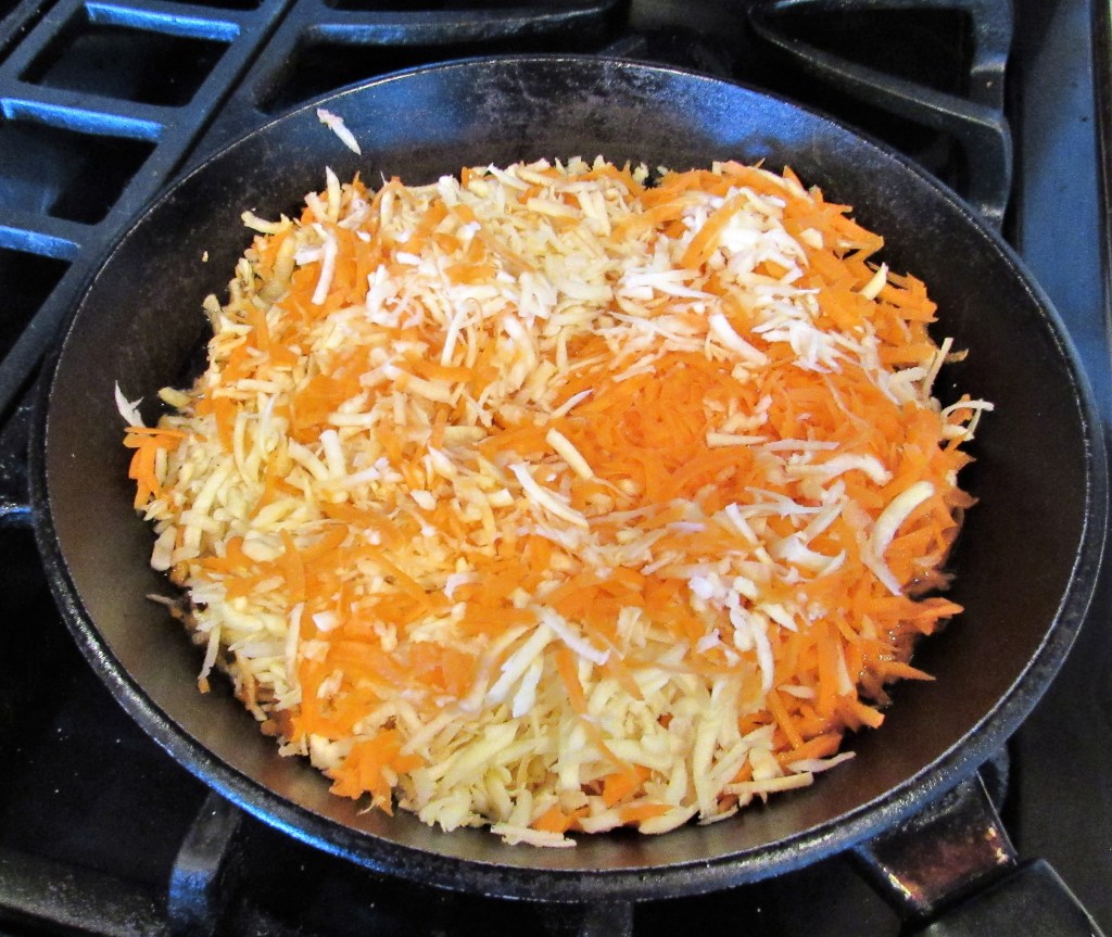 Peel and shred both the carrots and the parsnips and place them in a skillet with boiling water. Cook, stirring occasionally, for about 10 minutes, or until the carrots and parsnips begin to soften. Completely drain when they are done.