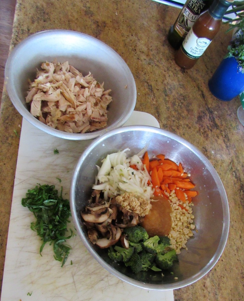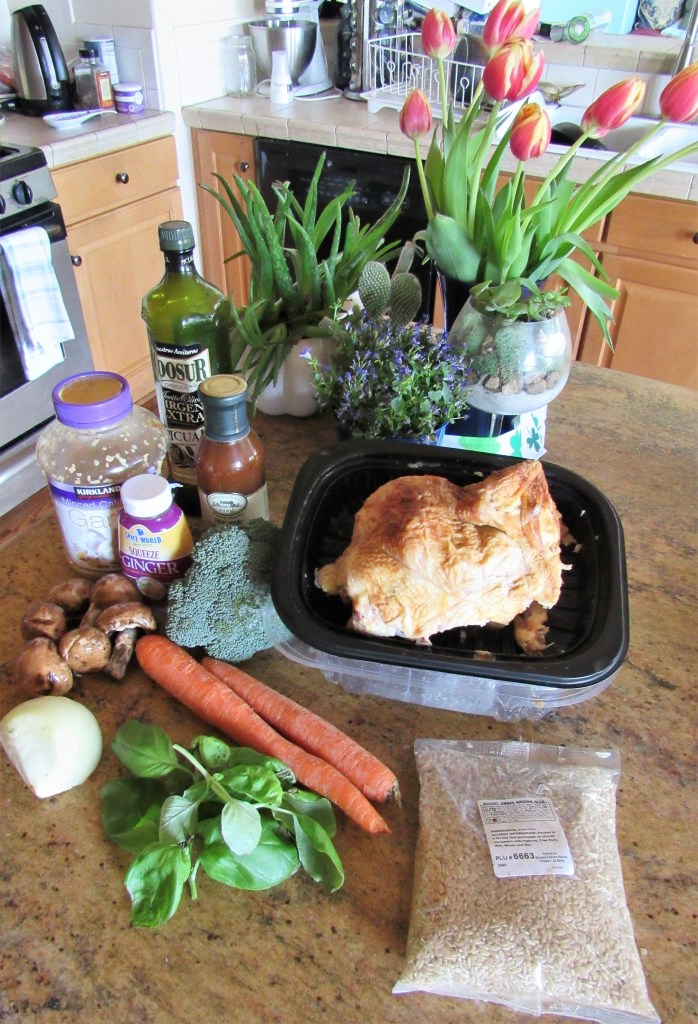 I started off with the rest of my Costco rotisserie chicken. Once I removed the meat from the bones, I shredded it. Then I added a bunch of fresh vegetables, like carrots, onions, broccoli, mushrooms and corn, and of course garlic and ginger. Once I cooked everything up, I served it all over some brown rice with potstickers on the side. And you KNOW there was wine as well. I served it with a crisp, citrusy chardonnay that went perfectly with the meal.